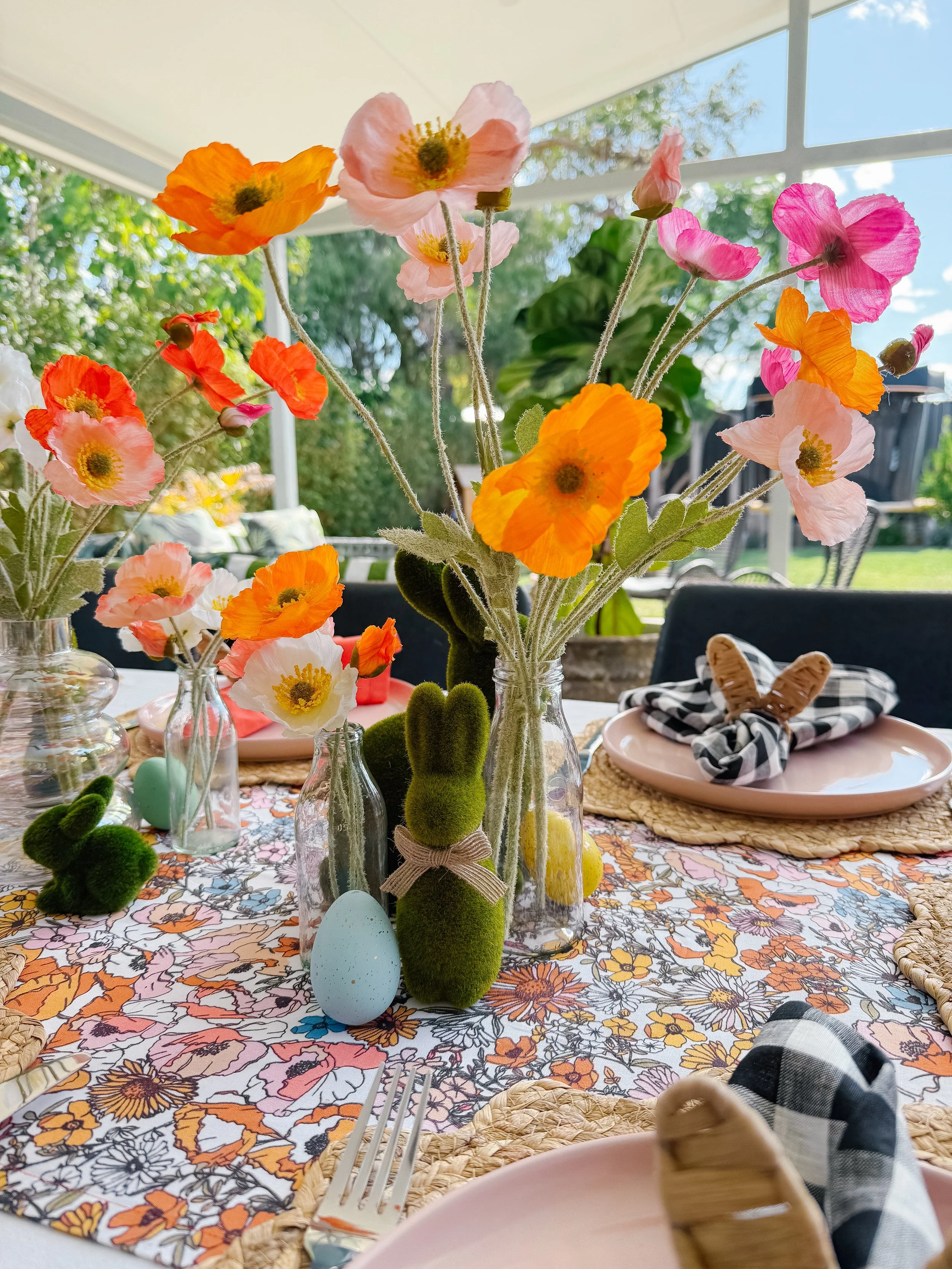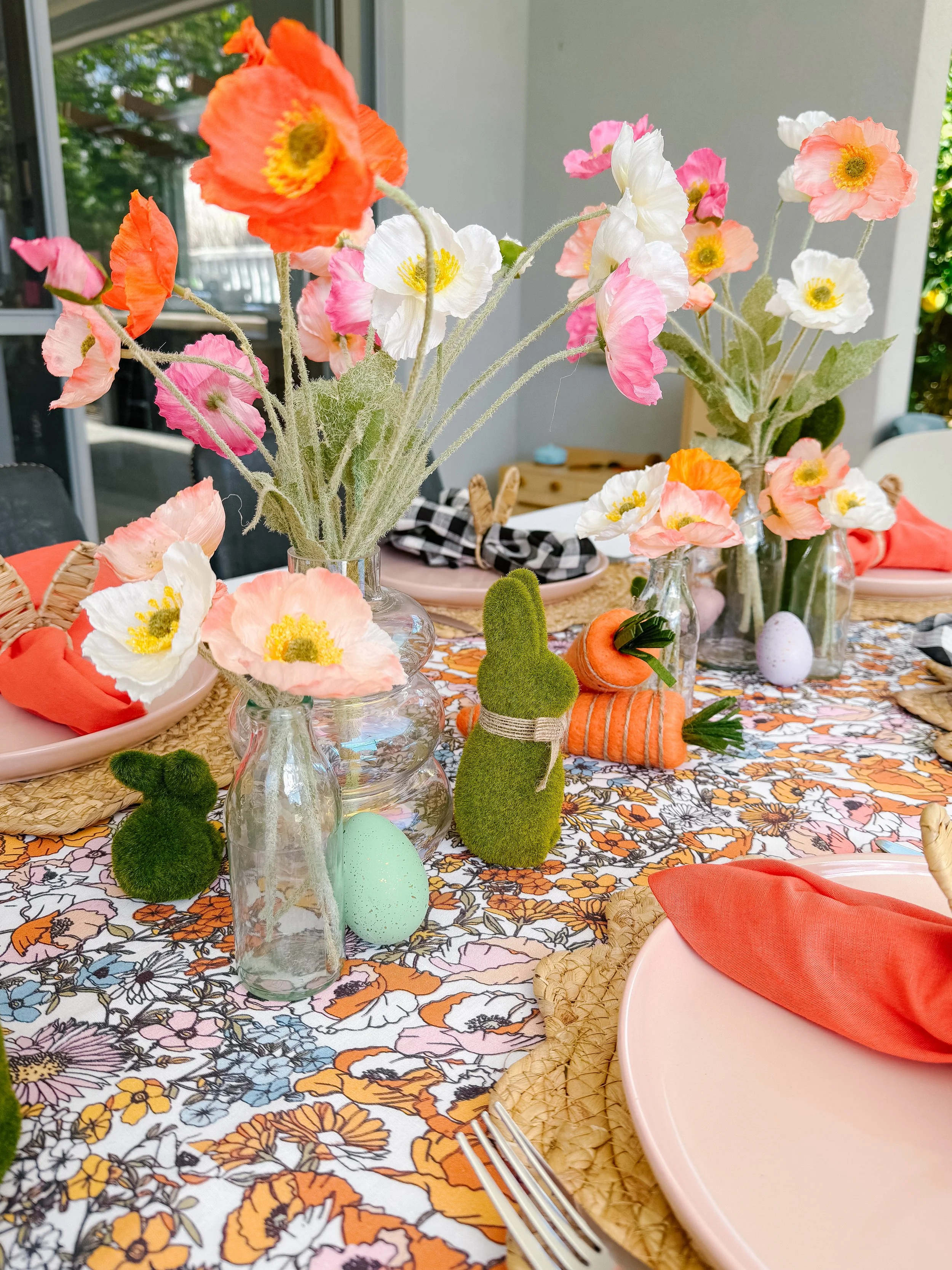 Rather than the classic Easter pastel, I chose slightly deeper, richer hues—burnt orange, soft coral, and warm pink—to give the flowers a more grounded, autumnal vibe. I arranged them in mismatched glass bottles for a casual, just-picked feel. Would you believe these were faux flowers?! I had them left over from a photoshoot I did a while ago. They were the perfect match for the linens I chose!